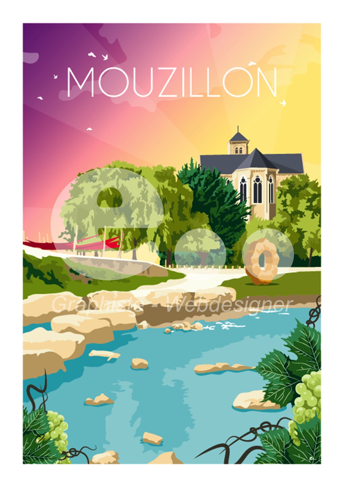 Entre rivière paisible, nature généreuse et patrimoine local, cette affiche capture l’essence du paysage mouzillonnais. On y retrouve une scène bucolique où se mêlent verdure, architecture et douceur de vivre, évoquant les balades au fil de l’eau et les paysages emblématiques de la région.